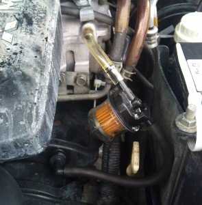Всё что нам понадобится – кусочек трубки и прозрачный фильтр “жигулёвский”. Прозрачный – что бы видеть летит или нет всякая дрянь с двигателя.