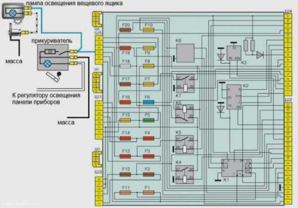 Заметим, что за работу прикуривателя отвечают два предохранителя – F18 и F9. В цепь первого из них включена подсветка бардачка.