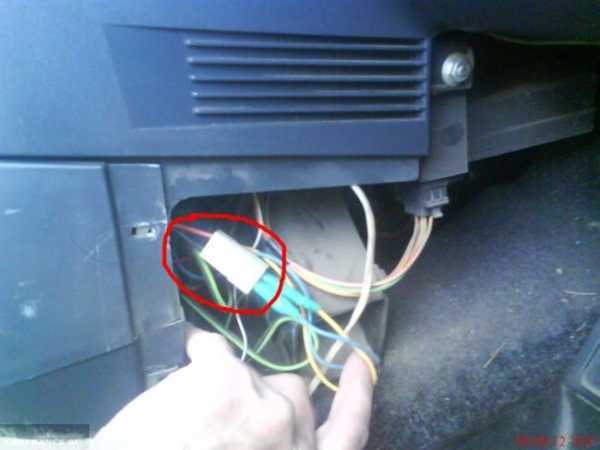 Обязательно отключите минусовую клемму АКБ (ключ «на 10»). Затем, сняв накладку возле ног пассажира, найдите разъём с чёрным и красным проводом (см. фото). Его разъединяют, так же, как разъём с жёлтым шнуром.