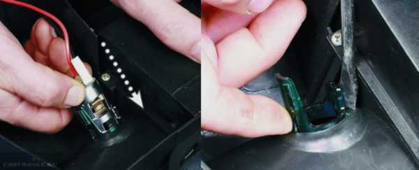 Собственно, доступ к прикуривателю теперь открыт. Выдавливайте его наружу, предварительно отключив фишку проводки. Он выскочит из клипс; вставляйте на его место новый, в него — проводку и в обратном порядке собирайте тоннель.