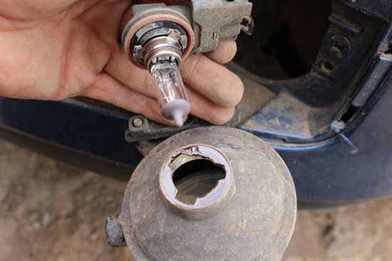 Теперь нам остается лишь добраться до лампы, повернуть ее на пол оборота и вытащить из противотуманной фары. Новую лампу за колбу трогать нельзя.