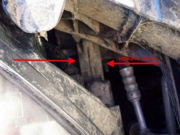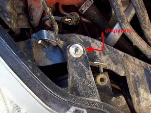 С помощью отвертки откручиваем болт крепления фары, а затем отсоединяем защелки как показано на фото и достаем фару из посадочного места. Отсоединив от нее штекера просто убираем в сторону.