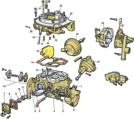 15 – поплавок; 16 – главный топливный жиклер первой камеры; 17 – игольчатый клапан; 18 – фильтр; 19 – главный топливный жиклер второй камеры; 20 – ось поплавка; 21 – жиклер холостого хода; 22 – трубка экономайзера; 23 – крышка карбюратора; 24 – пневмопривод воздушной заслонки; 25 – автоматическое пусковое устройство; 26 – крышка пускового устройства; 27 – пневмопривод дроссельной заслонки второй камеры |