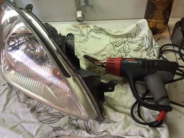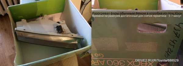 2.) Кладём фару в коробочку, ставим фен на «Hot», вставляем в отверстие коробки, 5-7 минут держим нагреваем, вытаскиваем фару, поддеваем стекло, тянем на себя и снимаем ;