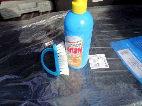 Зная, что коврики будут чуток пахнуть, да именно они только чуток пахнут, купил в первом же хоз. магазине средство для мытья посуды и щетку.