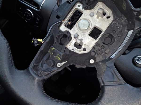 Подушку снимать довольно сложно, особенно в первый раз — руль блокируется автоматически, подушка держится на защелках и выходит очень туго. Отсоединил аккумулятор, вытащил контакты подушки, открутил болт на 24 который держит руль. Потом принес его домой и начал потихоньку обрезать все лишнее для установки кнопок. Это самый муторный и напряженный процесс — главное не срезать лишнего, а то будет некрасивая дырка сзади или сбоку 🙁 На все ушло часа два с половиной, но получилось получилось как надо. Проводка не совсем та что нужна для моей комплектации, пришлось немного колхозить, переставлять пины и подпаиваться, но все достаточно просто если следовать инструкции.