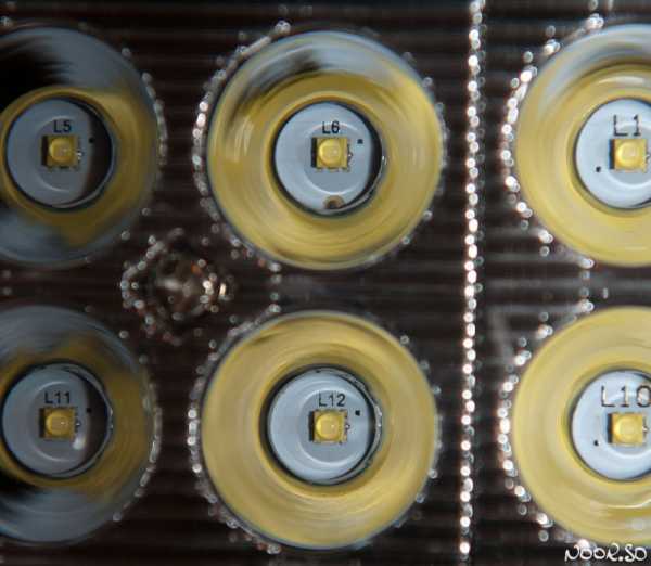 Видно, что крайние 4 светодиода имеют менее сфокусированную линзу