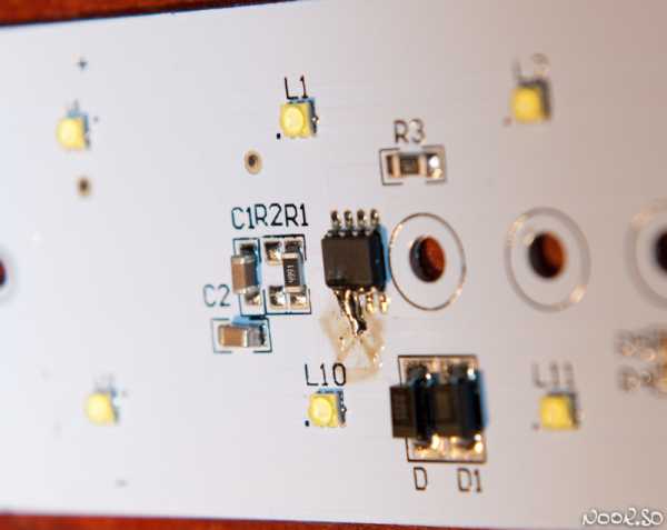 К сожалению, пропали еще несколько хороших фото печатной платы. Выложу то, что осталось на мобильном. Тут видно небольшой для такой мощности и частоты дроссель и то, что может заинтересовать человека с паяльником — токоизмерительные шунты R3 и R4. Они то и задают ток на светодиоды. В данном случае стоит только один на 0.1 Ом и можно чуть разогнать люстру, подпаяв к нему параллельно еще что-нибудь. Да, о частоте: она совсем небольшая и люстра немного пищит, слышно буквально с полуметра. Заливка дросселей лаком совсем не помогла избавиться от писка. Это особенности дешевой схемотехники, тут никуда не деться. Несмотря на небольшой размер и низкую частоту работы, дроссель при работе почти не греется, как и шим-контроллер, который драйвер.