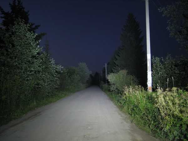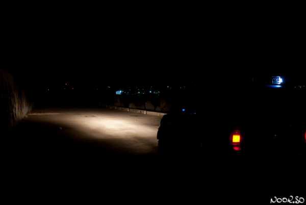 Хорошо видно что штатный дальний даёт только пятно где то в 80 метрах от машины. Люстра засвечивает всё вплоть до 120 и далее метров. Равномерный белый свет.