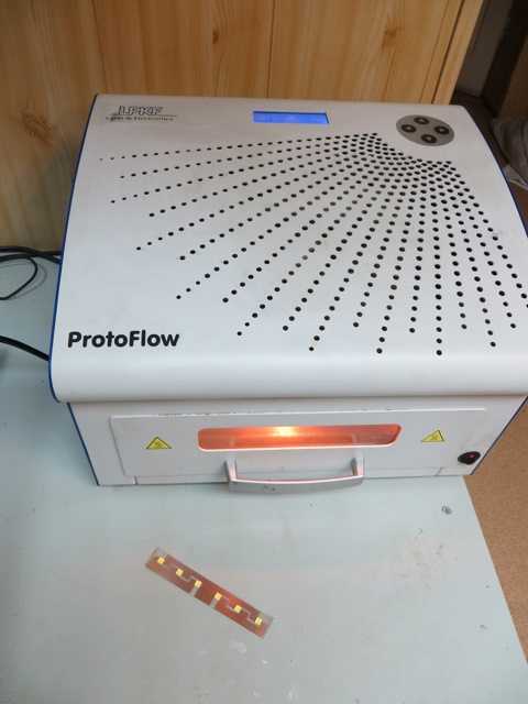 Или тупо тырим у жены сковороду и плавно разогреваем ее с нашей платой примерно до 200 градусов (можно при помощи мультиметра с термопарой проверять), при этом наблюдаем как паяльная паста превращается в припой и криво расставленные светодиоды за счет поверхностного натяжения расплавленного металла занимают свои законные места 🙂