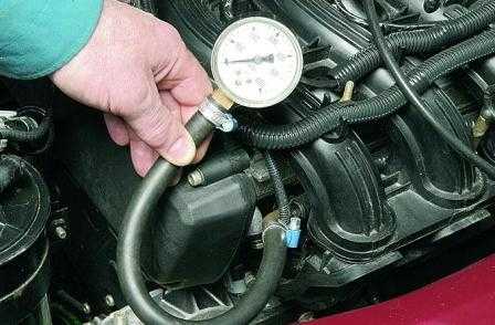 Когда бензонасос работает, измеряют давление в топливной рампе, которое, в зависимости от модели, отличается. При отсутствии манометра осматривают. Надавливают на золотник или снимают подающую трубку. Если включить насос, бензин должен подаваться ровной струей. Причину ее отсутствия ищут в фильтрах, которые со временем забиваются, или в топливопроводах.