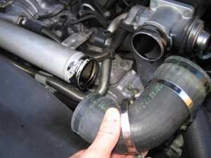 Чтобы узнать — гонит ли масло из турбины, необходимо открутить крепежные хомуты и отсоединить от выходного патрубка подающий рукав. Утечки масла, если они есть, будут видны. Дальнейшие действия: