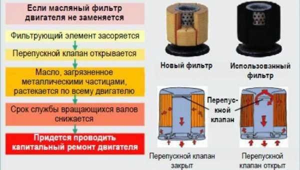 Фильтрующий элемент в состоянии улавливать и удерживать лишь определенный объем загрязнений. Когда он наполнен и «забит», открывается перепускной клапан фильтра и в системе, минуя фильтрующий элемент, начинает циркулировать неочищенное масло. Это ускоряет износ деталей двигателя и может привести к серьезным поломкам.