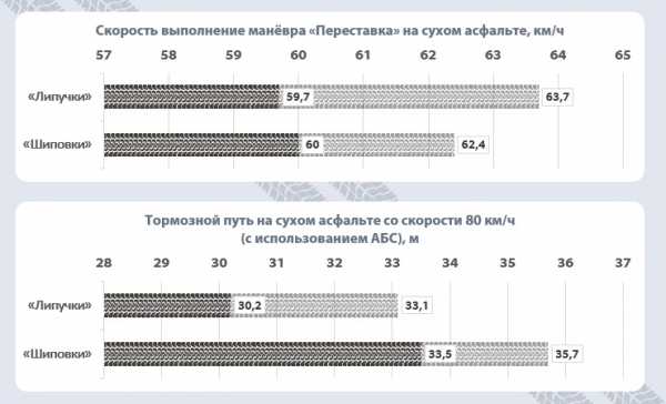 Хотя на сухом асфальте фрикционные покрышки, конечно, выиграли. Но разгрома не случилось! При торможении со скорости 80 км/ч «фрикционки» уехали на 28,1-31,4 метра, а «шиповки» — на 30,2-32,2. То есть разница между «худшим» и «лучшим» не слишком большая. Значит, в городе современные «шиповки» ведут себя не хуже «липучек».