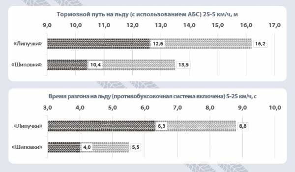 На льду ситуация не столь простая… Крутые «шиповки» вне конкуренции! Чтобы остановиться со скорости 20 км/ч, большинству «зубастых» моделей требуется от 7,0 до 8,2 м. В нешипованной категории разброс — от 8,2 до 9,2 м. Однако недорогие шипованные покрышки останавливаются за 8,7-10,5 м!!! То есть даже проигрывают фрикционным…