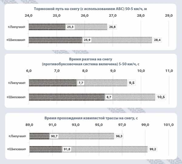 Может, вопреки мифам, фрикционные шины неожиданно блеснут на снежных и ледовых испытаниях? И действительно! На снегу «резина» без шипов оказалась крайне конкурентоспособной. По данным Авторевю, время разгона до 50 км/ч — в диапазоне от 7,7 до 9,5 с, а у «шиповок» — от 8,7 до 10,5 с. Пускай и небольшая, но разница есть. Также «беззубые» покрышки немного, но опередили «зубастых» конкурентов при прохождении извилистой трассы. У нешипованных колёс зачётные результаты — 90,7-96,3 с, у представителей «шипованного лагеря» — 91,8-99,2 с.)(фото 3)