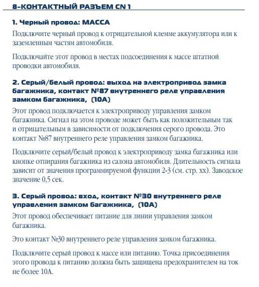 ЧЁРНЫЙ ПРОВОД: импульсный выход для управления замком багажника (+12В, 10А)