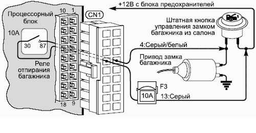 4. Серый/белый провод: выход на электропривод замка багажника, контакт №30 встроенного реле управления замком багажника, (10 А)