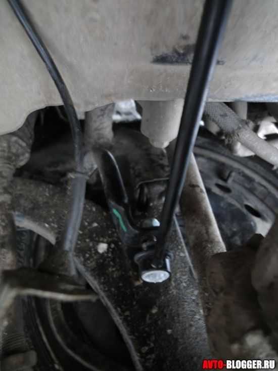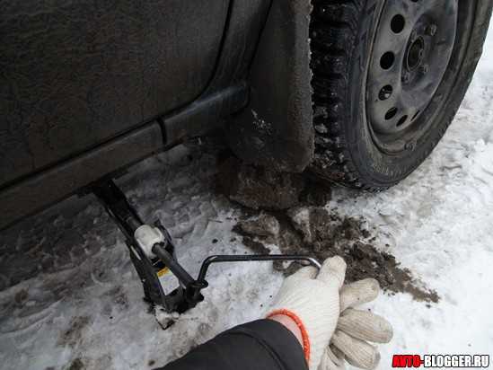 Еще одна хитрость — чтобы хорошо выходила, нужно подложить колесо, которое мы сняли под переднюю подвеску и немного опустить кузов.