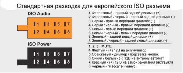Стандартный 16-пиновый европейский ISO разъем представляет собой, как правило сдвоенную колодку (2 по 8), подробная распиновка которой приводится ниже. Использование этого разъема в автомобиле значительно облегчает снятие, установку головного устройства в силу его универсальности. Большинство европейских производителей автомобилей используют его как базовый для подключения магнитолы.