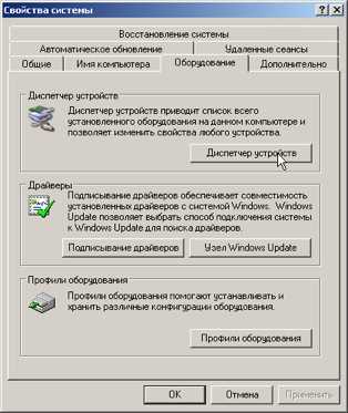 6. Пройдите на вкладку «Оборудование» и нажмите на кнопку «Диспетчер устройств»: