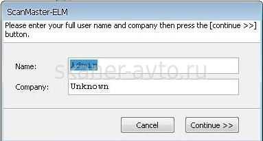 12. Теперь пройдем путь регистрации программы ScanMaster ELM v.2.1. Для этого запускаем установленную программу. Должно появится окно, представленное ниже. Можем ввести имя и компанию, а можем оставить без изменения. Нажимаем Contnue: