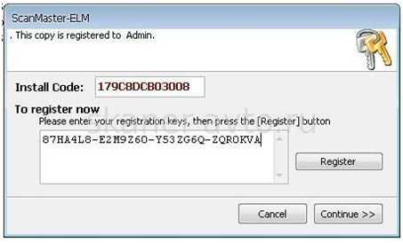 15. Теперь возвращаемся к окну программы ScanMaster ELM . Вставляем скопированный ключ в свободное поле. Нажимаем кнопку Register и Continue: