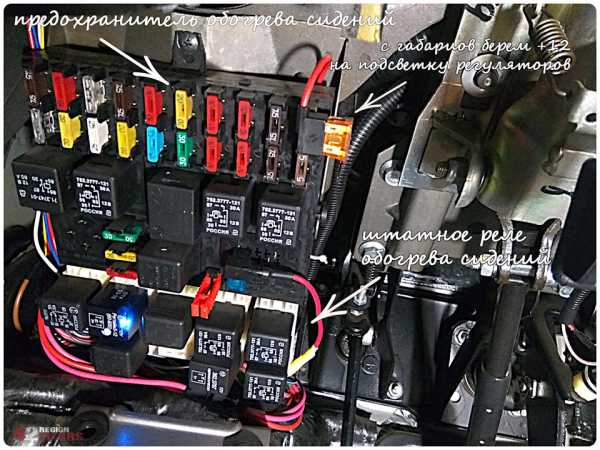 В блоке уже есть предусмотренные заводом предохранитель и реле для обогрева сидений (отмечены на фото). Можно подключить к ним. Я же поставил отдельное реле. Подсветку взял с габаритов, тем более вывод уже есть для ДХО.