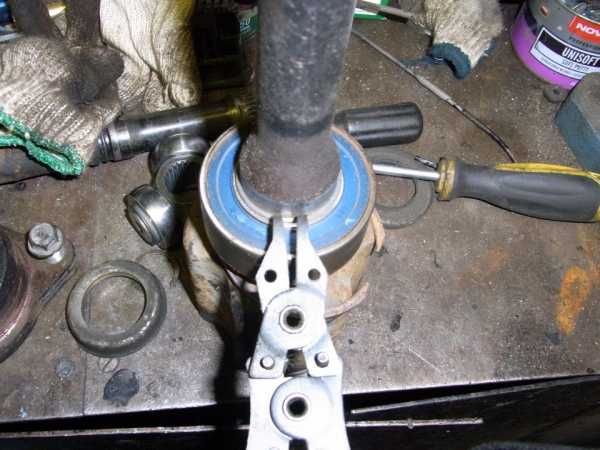 наставив молоток на подшипник, бьем по нему постепенно передвигая по кругу, можно использовать съёмник, но у меня нету с такими длинными ножками
