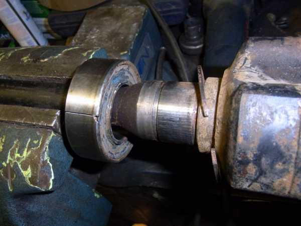 Теперь смазав вал осаживаем на него обойму с подшипником, (я испоьзовал трубу длинной чуть больше самого вала и по диаметру внутренней части подшипника, которая прилегает к валу. Не в коем случае не больше, чтобы не попасть по самим шарикам подшипника) осаживаем так же по кругу ударяя молотком по трубе
