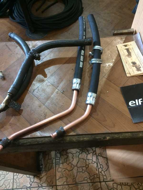 и посажены на клей, можно было поискать новый но подошли с пониманием к хозяину так как он не рассчитывал на замену двигателя). В ходе съёма коробки обнаружились отгнившие трубки которые идут на радиатор, поиски БУ ничего не дали, а новые стоят дороже чем машина решили попробовать их изготовить. На фирме которая делает рукава была только металическая трубка и я побоялся что не смогут они точно повторить форму трубок ( не зря, потому что видя как их гнут они точно не попали бы), а подогнуть метал особо не получится. Нашёл в городе медную и на следующий день поехал к ним со своей трубкой, но ничего против не сказали и сделали из моей трубки Трубки получились как по заводу.