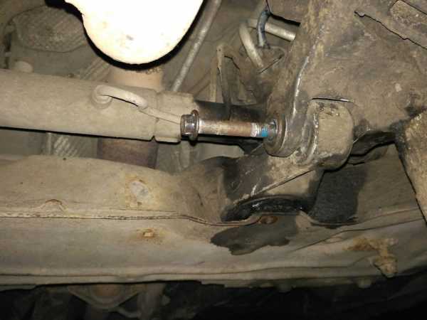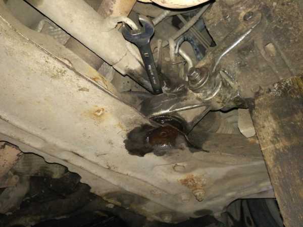Принялся откручивать болт на 17, который держит опору за подрамник. Болт не отдался, стал откручивать гайку на 17 верхнюю, с трудом отворачиваю гайку при том что ход ключа накидного очень маленький, а головка торцевая там вообще не влазит, рулевая рейка мешает. Даже после этого болт не отдался, закис во втулке опоры, зараза. В общем отломил головку болта( благо что у меня были болты в багажнике и нашёл подходящий диаметра и длины.