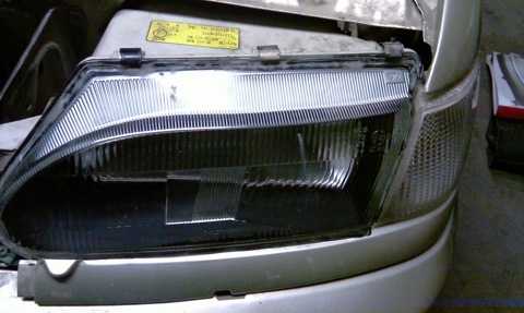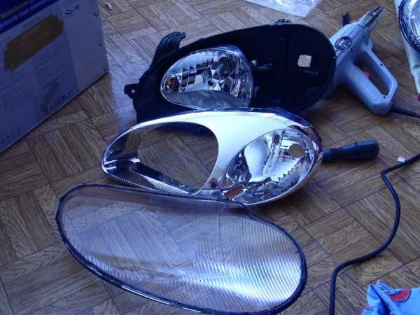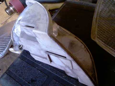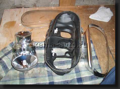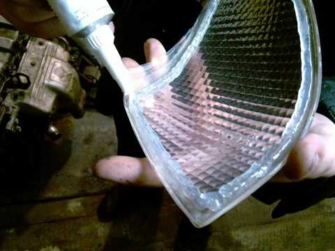 Стекло фар защищают с помощью малярного скотча, а потом отсоединяют само стекло. Возможно, оно посажено на герметик. Тогда его нагревают, поможет в этом строительный фен. Ножом аккуратно производят отсоединение стекла от основы. Плохо, когда оно соединено клеем. Тогда стекло потребуется срезать канцелярским ножом. Отражатель вынимается и начинается очередной этап работы.