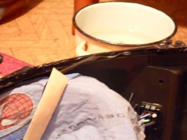 Итак. Берём корпус фары, на всякий случай закрываем тряпочкой отражатель головного света и прогреваем по кругу старый герметик…