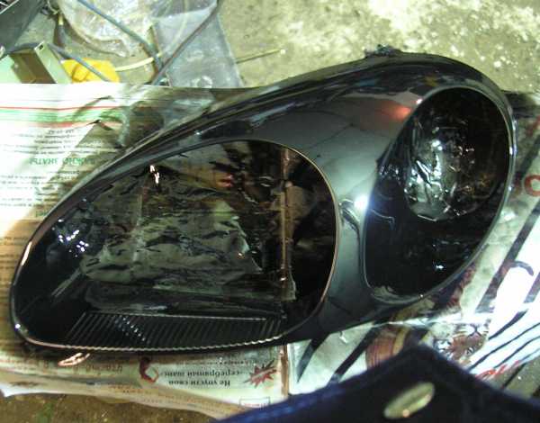Затем смываем всю пыль, тщательно вытираем отражатель, красим чёрной глянцевой краской в 4 слоя с сушкой между слоями, затем собираем фару и получаем:
