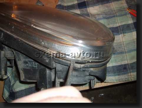 2. Снятую фару для удобства отсоединяем от реснички, снимаем 2 металлические защелки со стекла фары и откручиваем и винтик сбоку, который дополнительно соединяет стекло с корпусом, берем фен и начинаем медленно прогревать место стыка стекла фары и корпуса. Вначале не очень будет получаться, пока герметик не прогреется, потом будет легче.