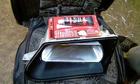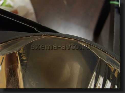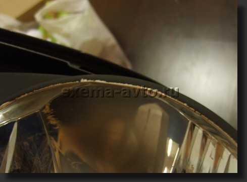 Снимаем всю бумагу, убираем старый герметик. Берём купленный вами герметик и наносим его на пластиковый корпус фары в канавку и устанавливаем стекло, для надёжности крепим скобки на место (5 штук) чтобы они фиксировали фару и прижимали, можно положить собранную фару к обогревателю.