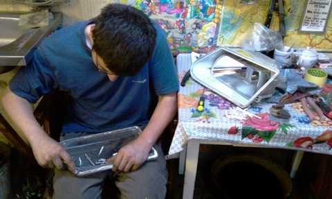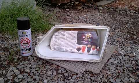 Снимаем скобки которые прижимают стекло к пластмассе, берём нож и очень аккуратно режем старый герметик, если всё сделать правильно, то стекло не треснет. и просто отделяем его от пластикого корпуса. Далее зачищаем декоративный отражетель наждачкой, так чтобы не было отблеска, потом берём газету, плотно заматываем ею основной отражатель и идём на улицу наносить первый слой краски. Покрываем краской равномерно, потом даём ей высохнуть и идём наносить второй слой. А там уже вам решать хватит вам два слоя после высыхания или нанесёте ещё один. (Мне хватило два слоя)