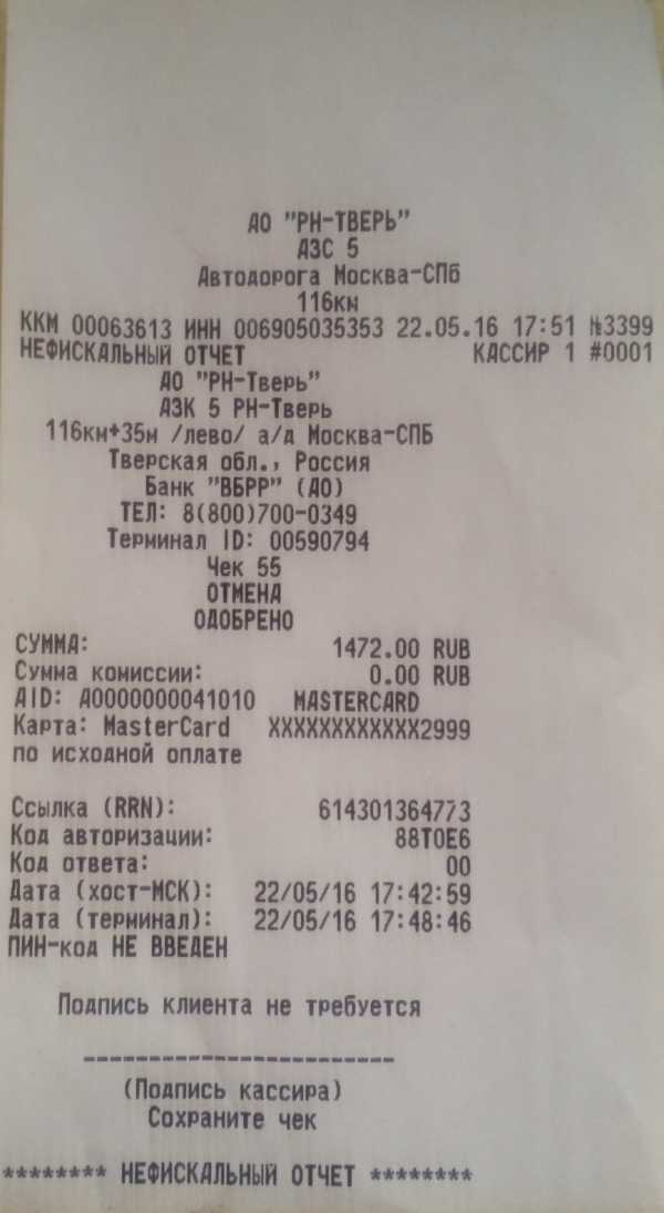 Когда заправка завершилась, то кассирша радостно мне сообщила, что в бак не вошло всего-то… 3 литра. Рассказав ей историю, как мне в 20-ти литровую канистру на этой заправке в 90-е, когда её ещё не купил ЮКОС, налили 15 литров (знал такую особенность и избегал заправляться на ней, но тут дело было ранним утром и на других АЗС был технологический перерыв), она на голубом глазу меня заверила, что у них такого не бывает 🙂 Охотно верю ей, но верится с трудом. Когда заправка принадлежала ЮКОСу — недолила не было. Боролись за клиента. В данном случае что-то доказывать было бесполезно. РУКОВОДИТЕЛИ РОСНЕФТИ, разберитесь со своим персоналом. Больше заправляться на вашей «фирменной» заправке не буду. Хоть ВР и принадлежит вам, буду пока заправляться на ней. На ВР, в Клину клиентов не обманывают. Ни к качеству топлива, ни к его объёму на ней вопросов нет. Что не могу сказать про заправки ВР на Новой Риге и на объездной Твери. Но это так, для информации. Есть же ещё по трассе куча других заправок. Например, ЛУКОЙЛ или Газпромнефть. Но это лирическое отступление, рассказать-то хотел несколько о другом, о процессе оплаты. И так, продолжу описание бизнес-процесса оплаты полного бака по пластиковой карте. Дальше было следующее: кассир отменила полностью предыдущую транзакцию, после чего предложила оплатить заправленное топливо 🙂 Т.е. вместо одной операции по карте потребовалось проведение трёх!