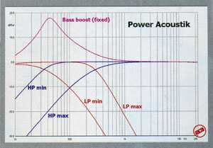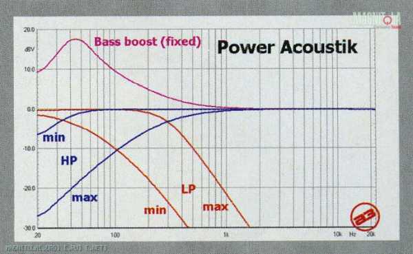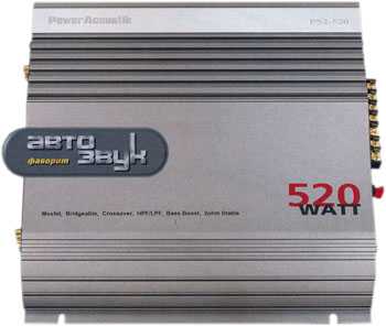 Внешний вид усилителя Power Acoustik выгодно отличает его от предшественников. По крайней мере титановое покрытие корпуса придаёт этому аппарату весьма современный вид. Все сильноточные зажимы расположены в одном блоке, не иначе изготовленном на заказ. Ширина зажимов 11 мм (питание) и 8,3 мм (все остальные). Номинал предохранителей такой же, как у предыдущего испытуемого, только здесь он один. В этом усилителе пара линейных выходов, и даже входы высокого уровня, но буст, к сожалению, ступенчатый. Как мы скоро увидим, у сегодняшних одноклассников это не редкость, но 18 дБ — всё-таки перебор. Буст можно включить, когда аппарат в широкополосном режиме либо при задействованном фильтре НЧ. Диапазон перестройки фильтров от 40 до 250 Гц. Понятно, что PS2-520 рассчитан в первую очередь на работу с сабвуфером или широкополосным фронтом, но в ряде случаев никто не помешает использовать его и в трёхполосной системе — для басов или СЧ/ВЧ-комбинации.