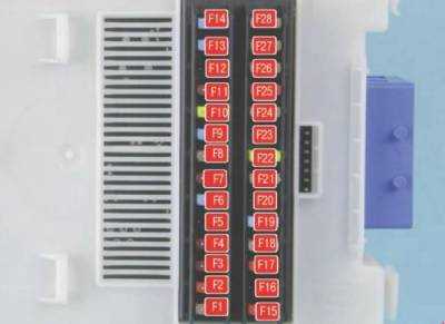 Расположение предохранителей и реле в монтажном блоке, установленном в подкапотном пространстве