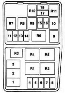 Схема расположения предохранителей и реле в блоке под капотом. (модели 1999-2000 года