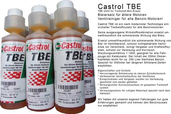 Castrol TBE ΠΏΡΠ΅Π΄ΡΡΠ°Π²Π»ΡΠ΅Ρ ΡΠΎΠ±ΠΎΠΉ ΠΊΠΎΠΌΠΏΠ»Π΅ΠΊΡΠ½ΡΡ ΠΌΠ½ΠΎΠ³ΠΎΡΡΠ½ΠΊΡΠΈΠΎΠ½Π°Π»ΡΠ½ΡΡ ΠΏΡΠΈΡΠ°Π΄ΠΊΡ ΠΊ Π±Π΅Π½Π·ΠΈΠ½Ρ. ΠΡΠΈΠΌΠ΅Π½ΡΠ΅ΡΡΡ Π² ΡΠΎΠΎΡΠ½ΠΎΡΠ΅Π½ΠΈΠΈ 1:1000 c Π±Π΅Π½Π·ΠΈΠ½ΠΎΠΌ, ΠΈΠΌΠ΅ΡΡΠΈΠΌ ΠΎΠΊΡΠ°Π½ΠΎΠ²ΠΎΠ΅ ΡΠΈΡΠ»ΠΎ ΠΎΡ 91 Π΄ΠΎ 98 ΠΏΠΎ ΠΈΡΡΠ»Π΅Π΄ΠΎΠ²Π°ΡΠ΅Π»ΡΡΠΊΠΎΠΌΡ ΠΌΠ΅ΡΠΎΠ΄Ρ. ΠΡΠ΅Π΄Π½Π°Π·Π½Π°ΡΠ΅Π½Π° Π΄Π»Ρ Π»ΡΠ±ΡΡ
