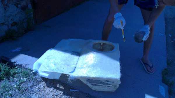 Перед тем как начать обтягивать ящик карпетом, покрываем его специальным раствором, который улучшает адгезию материалов