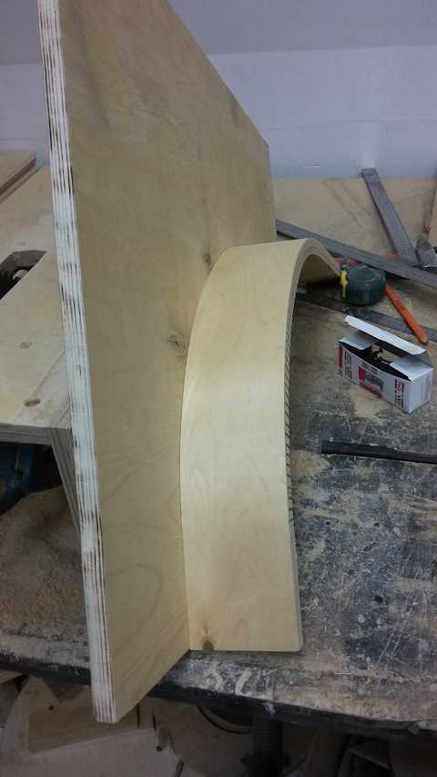 Самое интересное началось после, на «как же гнуть стенку»… некоторые делают эту стенку из нескольких слоев 4 фанеры, но я решил не искать легких путей, и гнул 18 фанеру…надпилами!