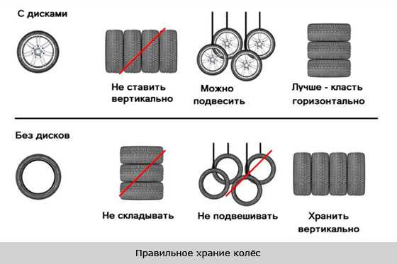 Бортированные колёса нужно хранить накачанными и подвешенными на стены сухого и тёмного помещения (чердак или гараж), а шины снятые с дисков – в стопках или вертикально. В последнем случае время от времени их нужно менять местами или проворачивать. Кроме того, сегодня многие автоцентры предлагают услугу хранения покрышек, для чего они имеют специализированные помещения, оборудованные особыми стеллажами. При таком хранении и соблюдении всех правил, автомобильная резина может сохранять эластичность до десяти лет.