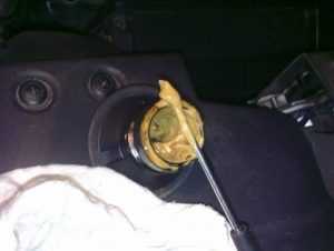 Вынул щуп и ужаснулся — он был весь в белом налёте типа майонеза. Под крышкой на ГБЦ налёта не было. Показал мастерам — сказали, что тосол в масло давит, скорее все потребуется заменять прокладку ГБЦ.