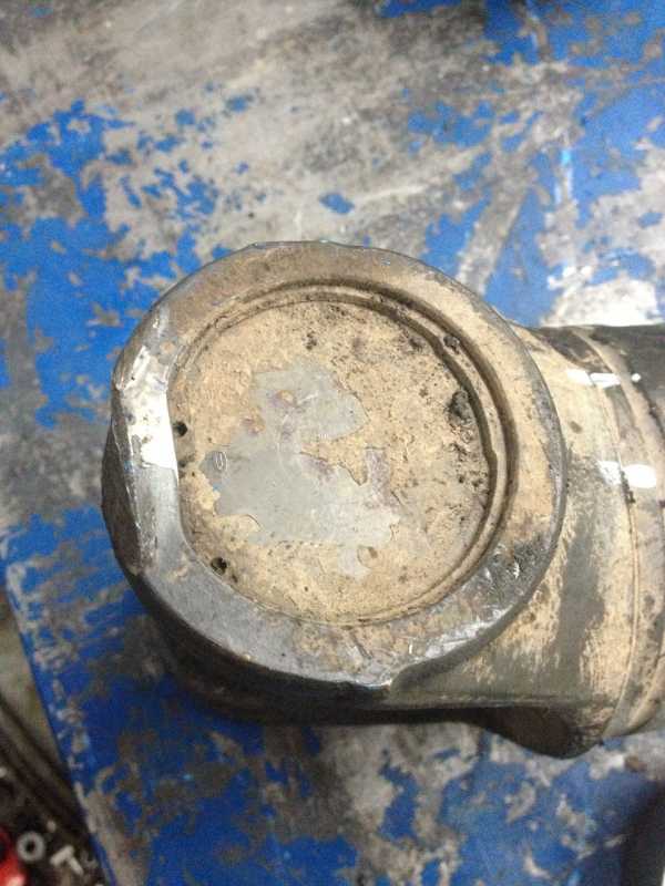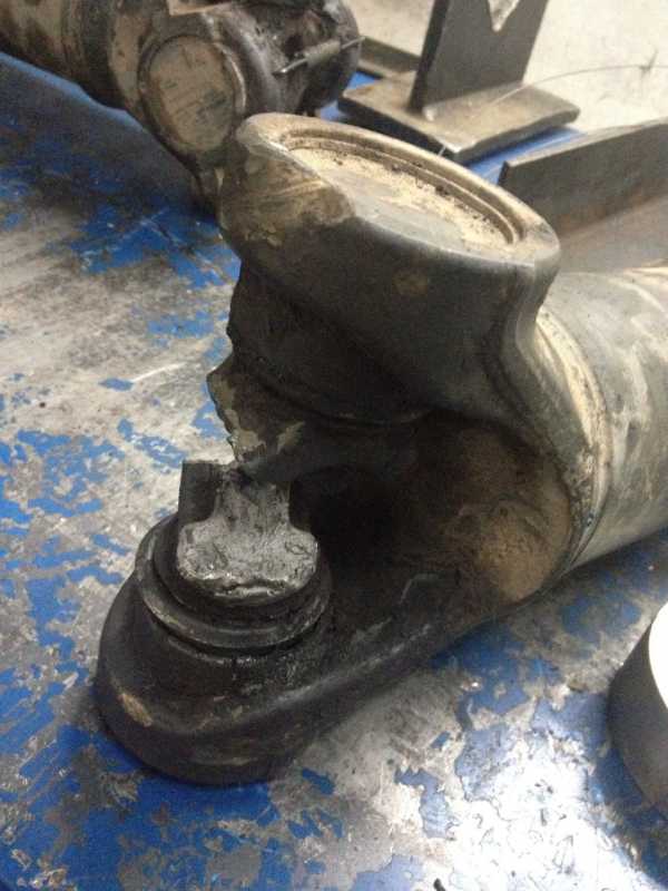 4. Далее, перед Вами фотографии оборванной крестовины карданного вала задней тележки (СКАНИЯ 6х4), крестовина сломалась и по инерции кардан ещё пару раз по раме ударил, на фото видно загнутое ухо вилки кардана.