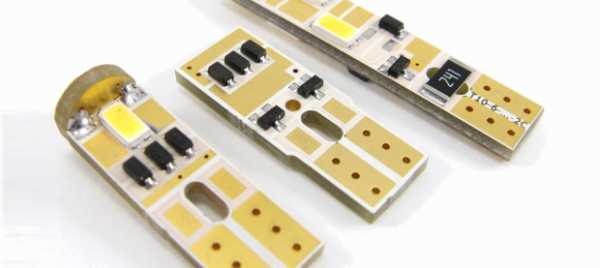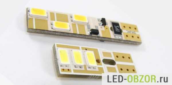 Направленный боковой поток света позволяет получить лампа W5W-4SMD. В ней на одной стороне платы установлено 4 светодиода. С другой стороны находятся резисторы.