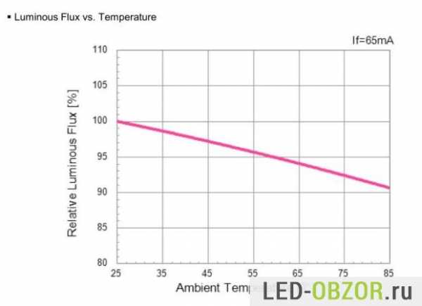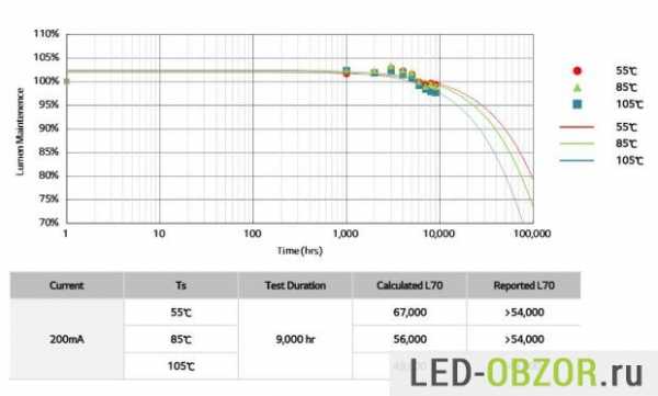 Более качественные известных производителей могут допускать приличные температуры нагрева. И даже при перегреве они могут работать достаточно долго. Например, используемые Дилас светодиоды LG Innotek имеют следующую зависимость срока службы от количества градусов. Производитель подтверждает, что даже при 105° снизят свою яркость на 30% только через 50000 часов.